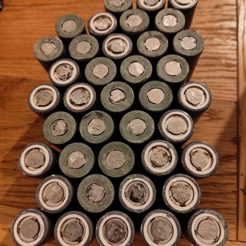 Jeg har også ca 2500 celler fra diverse produsenter. Her er det det en blanding av type celler, 21700 og 18650, og produsenter. Her selges 18650 for 5kr per stk og 21700 for 10kr per stk. minste pakkene er på ca 30 celler. Her er ikke cellene sjekket og jeg vet ikke hvilke celler som er der. Kommer heller ikke til å sjekke så det får man gjøre selv.