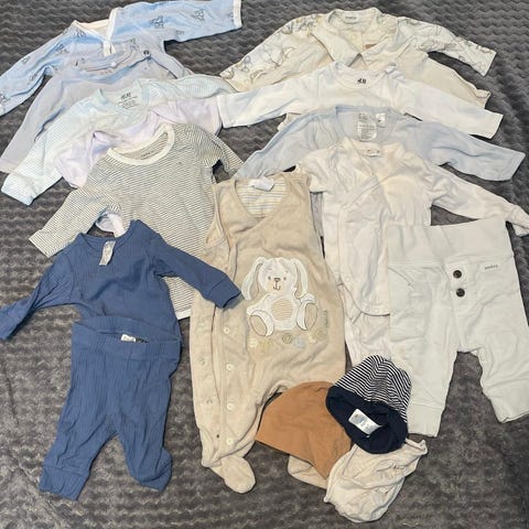 Klærne er av veldig myk og god bomullskvalitet, perfekt for den sarte huden til en nyfødt. Alt er svært pent brukt, fremstår som nytt uten flekker eller slitasje.