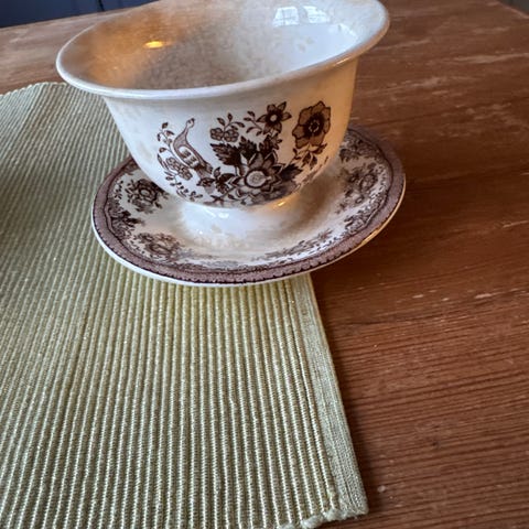 Lot med forskjellige deler og kuverter i stråmønster. Ene kuverten ser veldig gammel ut, se stempel. Asjetten har et skår på undersiden. Alt utenom sukkerskål og fløtemugge har grønt stempel, men de varierer litt. Se bilder. Selges samlet, kan sendes for kjøpers regning.