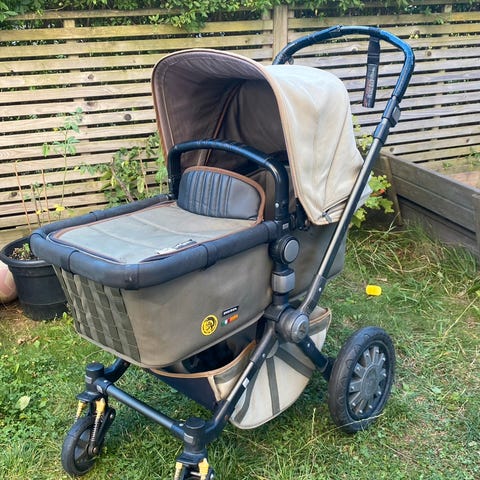 Vogna har noe slark i høyre del av håndtaket etter en flytur, og selges derfor billig. Vil være ypperlig som sovevogn i barnehage. Den lar seg også helt fint trille på tur, men man kjenner at det gir mer etter på høyre side enn venstre når man f.eks skal løfte fronten over fortauskanter o.l. Det har ikke vært forsøkt reparert.