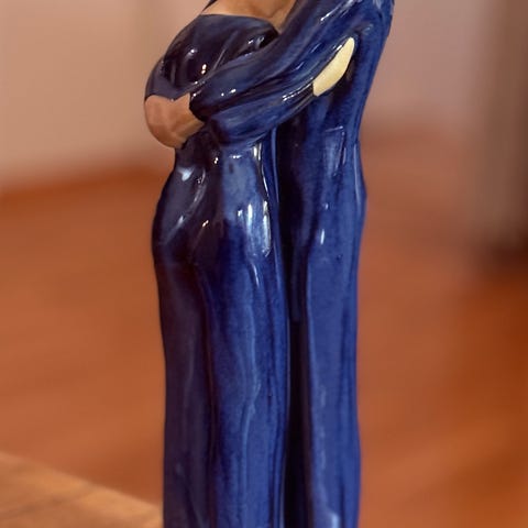 Figurgruppe i keramikk som viser en mann som spiller fiolin og en kvinne som spiller klaver. Figuren er dekorert med detaljer i svart og gull på en lys base. Egnet som dekorativt samleobjekt eller interiørpynt.
