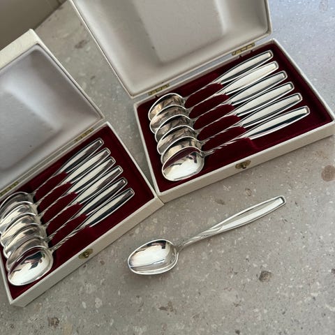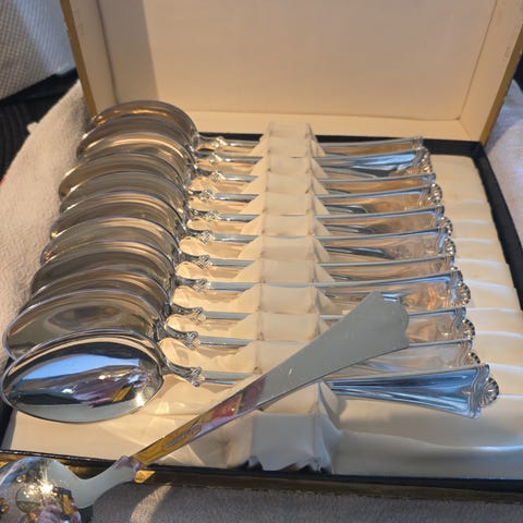 Selger bestikk/sølv, alt er veid med kjøkkenvekt, den viser 959 gram.