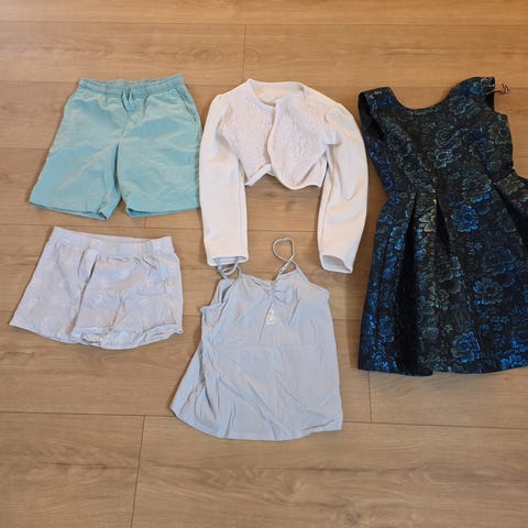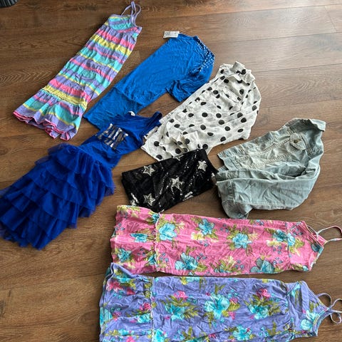 Gul kjole med blomstermotiv. Ingen av dem er brukt mer enn et par ganger.