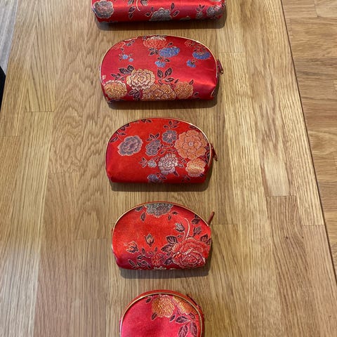 Hjemmesydde punger for et allsidig bruk, størrelser og stoffmønster varierer. Pungene er polstret fra innsiden.
