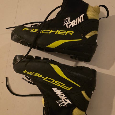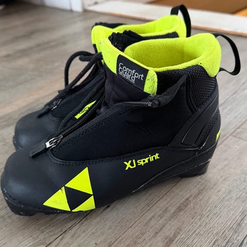Fischer XJ Sprint skisko i størrelse EU 32. Skiskoene er svart med gule detaljer og har en innersåle som måler omtrent 20 cm. Designet for å gi støtte og komfort ved langrenn eller andre skiaktiviteter.