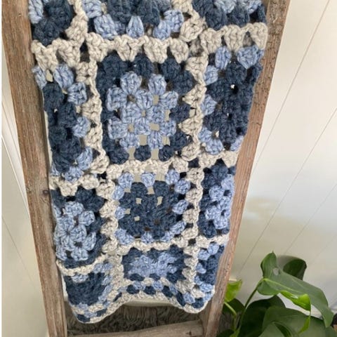 Vognteppe med lyseblå fleece bakside. Teppet er ikke brukt. Det er umulig å ta ordentlig bilde av baksiden med fleece. Fargen er lyseblå og ikke falmet eller flekkete på noen måte.
