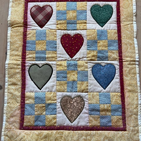 Vognteppet er quiltet med fine detaljer som hjerter og en bamse.
