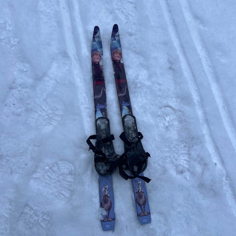 Førstegangs ski og staver til barn, som brukes med vanlige sko. Pent brukt.
