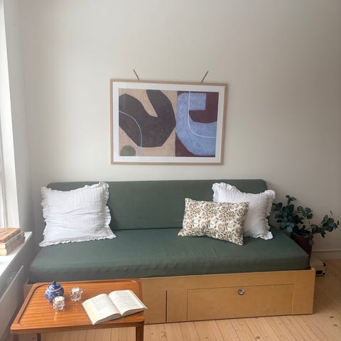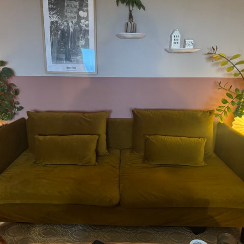 Selger pent brukt sovesofa fra Karup Design i fargen Olive Green. Sovesofaen ble kjøpt ny for kr 8469 på Ellos for ca 2 år siden.