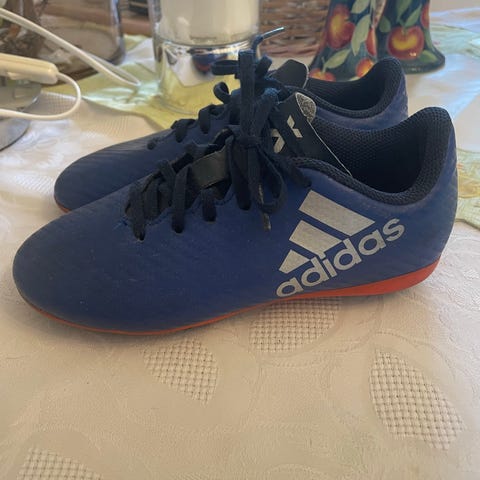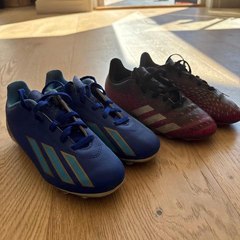 Adidas fotballsko i størrelsen 31. Ett par i hvit med oransje detaljer og knotter for utendørs bruk. Ett par i hvit med grønne detaljer og flat såle for innendørs bruk.