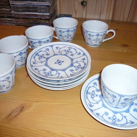 Figgjo Kaffekopp med skål i porselen. Settet består av to kaffekopper med tilhørende skåler. Designet inkluderer dekorative figurer på koppene. Passer til servering av kaffe.