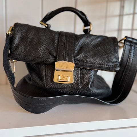 Marc Jacobs skulderveske selges. Vesken har svarte håndtak og detaljer i gullfarge. Vesken er godt brukt og er noe slitt på håndtakene. Bildene viser bruksmerker. Skinnet på selve vesken ser veldig fin ut uten synlige bruksmerker.