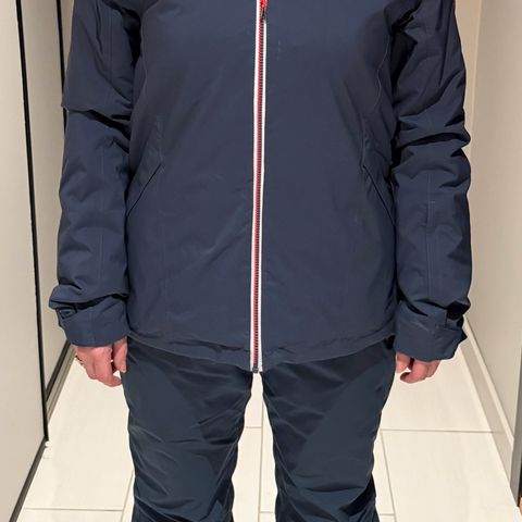 Helly Hansen skidress i størrelse M for kvinner. Dressen er grå med detaljer i rosa og har en isolert jakke og bukse, egnet for vinteraktiviteter som ski og snølek.