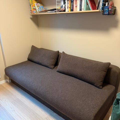 Moma boucle sofa fra Bedre nætter i fargen brun selges grunnet flytting! Kjempe praktisk sovesofa som fint har plass til 2 personer ved overnatting. Madrass medfølger som kan legges i skuffen under sofaen! Nypris 15 000,- + frakt. Selges for kr 10 000,-.