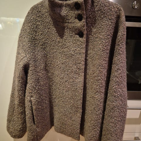 Nydelig bouclejakke, str 38, brukt en gang, kjøpt sist høst, kr500, må hentes.