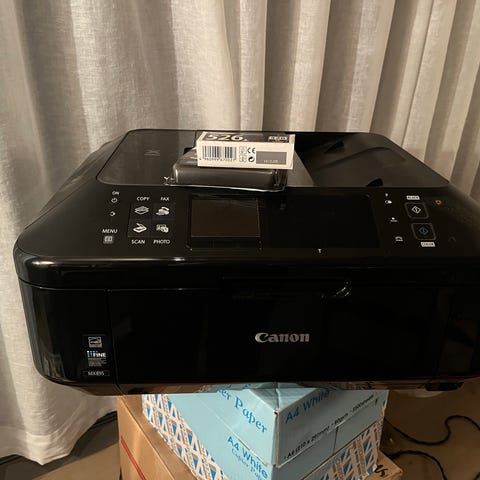 Canon Pixma MX925 multifunksjonsskriver med fargeskjerm og flere funksjoner for utskrift, skanning og kopiering. Leveres med tilhørende kabler og fire blekkpatroner i forskjellige farger.