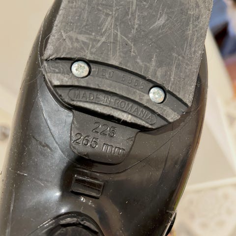 alpinstøvler i svart farge, størrelse 225 (265 mm). Støvlene har to spenner for justering og er laget for alpinski.