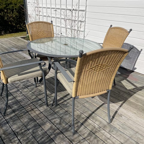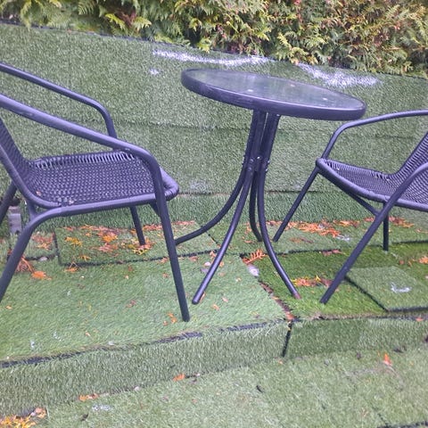 Metall bord med glassplate, egnet for utebruk. To rottingstoler følger med, designet for komfort og holdbarhet. Passer til uteområder som balkong eller terrasse.