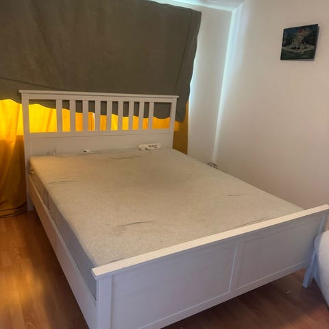 IKEA seng ramme i hvitt tre med lamellbunner. Stor dobbeltseng med god støtte for madrass. Enkel design, lett å bære og sette sammen. Enkel og fleksibel å transportere, passer i vanlig personbil.
