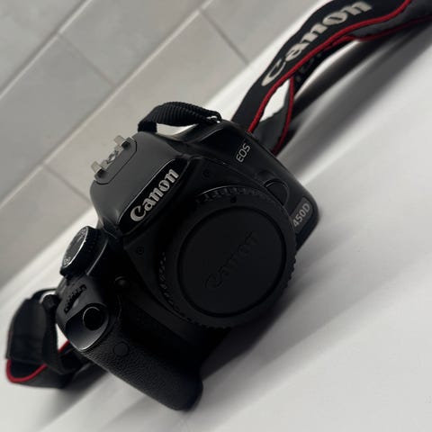 Canon EOS 450D speilreflekskamera m/ kit objektiv 18-55mm. Pent brukt. Medfølger kameraveske, batteri og batterilader, kamerarem + brukermanual.