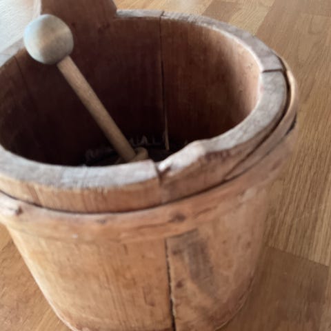 Antikk kiste laget av tre med buet lokk, metallbeslag på kantene og hengsler. Kisten har et enkelt låsesystem og et innvendig rom med en avdeling som kan løftes ut. Passer til oppbevaring av ulike gjenstander.
