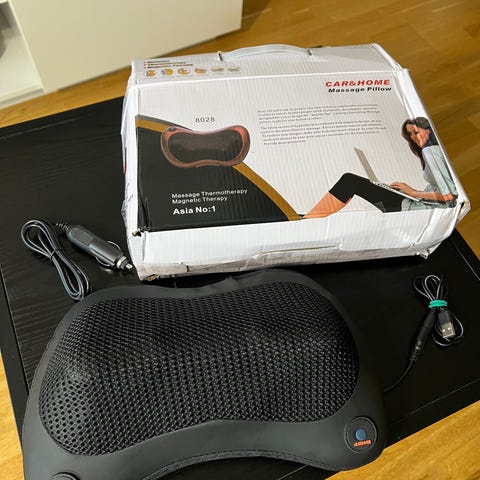 Nakkepute til flyreiser o.l. Nakkeputen har batteridreven (2 x AA-batterier) massasje, med ulike massasjeprogrammer.