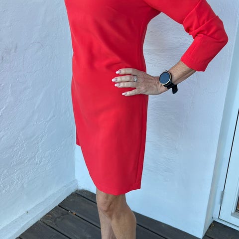 Rød Zara-kjole i kraftig og varm kvalitet selges. Kjolen har et enkelt og stilrent snitt med rette linjer som sitter pent på kroppen, og trekvartlange ermer som gjør den perfekt for kjøligere dager. Det litt tykkere stoffet gjør den godt egnet til høst og vinter, enten alene med strømpebukse eller sammen med en jakke eller cardigan.