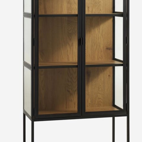 Pent og solid vitrineskap i heltre med glassdører og romslige skuffer. Klassisk design som passer godt i stue eller spisestue. Normal bruksslitasje.