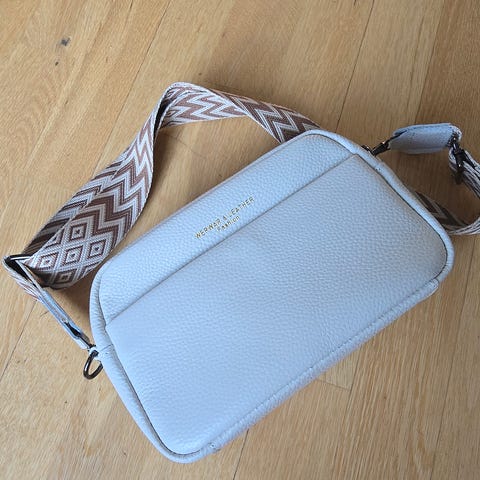 Stockholm Design skulderveske i skinn, designet for dame. Vesken har to separate rom med glidelås, og en avtagbar skulderrem. Hvit farge.