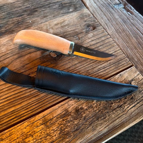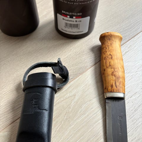 Morakniv ash litt usikker på modellen. Selges da den ikke blir brukt.kommer an på hvilken vei den er i slira,men den ene veien stikker knivbladet litt ut av slira.se( bilde) Kniven har så og si ligget i sekken og er knapt brukt. Knivbladet er vasket og kan se litt møkkete ut på bilde.