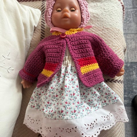Heklet i garnet Knæsj ,flerfarget moulinegarn.