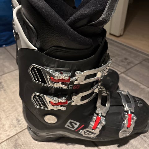 Salomon Quest Access 70 alpinstøvler i svart og rød farge for herre. Størrelse 270 mondopoint som tilsvarer ca 42 i vanlig skostørrelse. Støvlene har fire spenner og en justerbar power strap for god støtte og tilpasning. Designet for alpinbruk med fokus på komfort og ytelse.