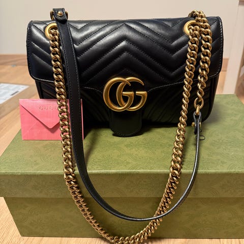 Gucci veske - modell: GG Marmont Large Shoulder Bag. Vesken har gullfargede metallkjeder og detaljer, og en quiltet mønsterdesign på utsiden. Den har en romslig åpning med klaff og magnetisk lukking. Passer til daglig bruk og ulike anledninger. Veldig lite brukt og ser nesten ny ut. Ubrukt kortholder kan også kjøpes ved til 2800kr. Følger med kvittering.