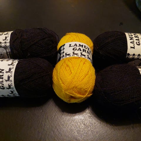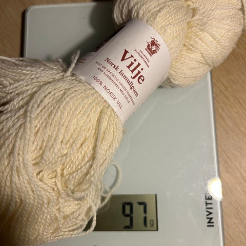 Røros Lamullgarn Rauma garn, 6 nøster à 50 gram i blandede farger offwhite, grønn og gul. Garnet er egnet for strikking og hekling, laget av lamull. Informasjon om vask og behandling finnes på etiketten.