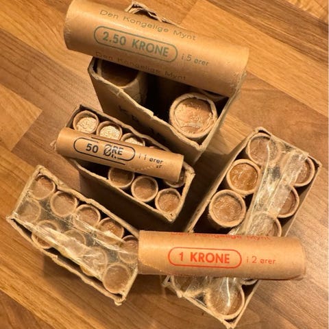 Ikke lett å se årstall på myntene, men tror iallfall at 10kr kan være 1983