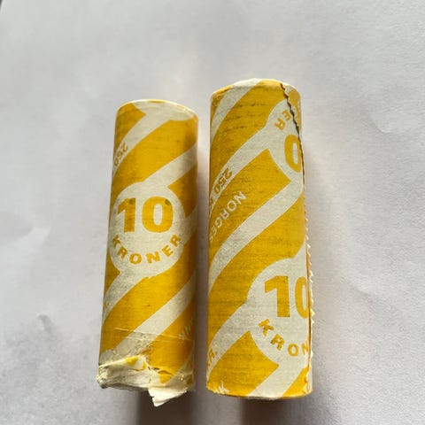 2stk 2 øre myntruller og 1stk 10kr myntrull