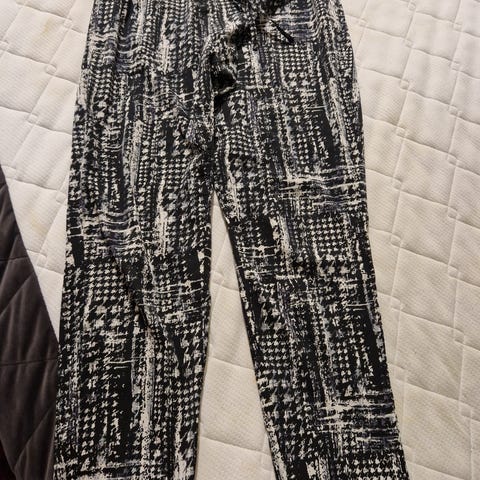Bukser i størrelse 36 for kvinner. Stripete hvit og beige strikket look.