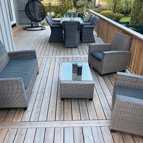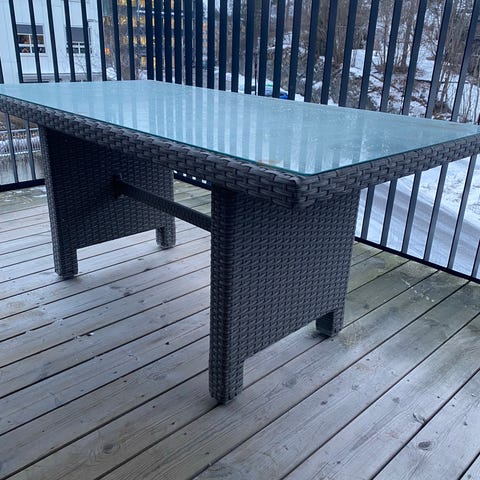 Hjørnesofa med tilhørende bord. Sofaen har hvit ramme i flettet materiale og grå puter. Bordet har glassplate på toppen. Passer til bruk på balkong eller uteplass.
