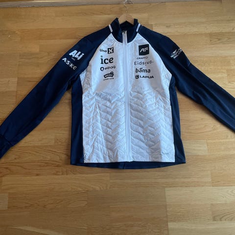 Craft jakke i størrelse L for herre. Jakken er designet for sport og aktivitet, med flere logoer på forsiden. Den har lange ermer og er laget i et lett materiale som egner seg til ulike utendørsaktiviteter.