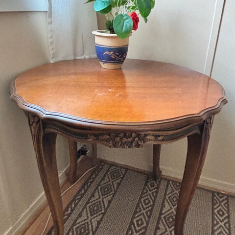 Bord i tre med klaff på begge sider og en skuff under bordplaten. Bordet har fire ben med dreide detaljer og kan foldes ut for større bordflate. Selges pga flytting.