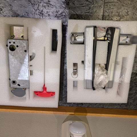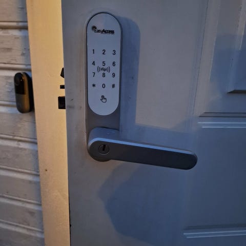 EasyAccess Easy903 G2 døråpner. En mekanisk enhet designet for å åpne dører, med metalldeler og fjærer synlige i konstruksjonen. Produktet har en sølvfarget finish.