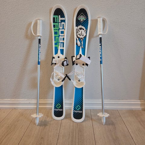 Hamax Frost skisett i plast med tilhørende staver. Pent brukt, ingen feil eller mangler.
