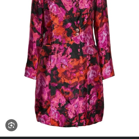 YAS blazer dress i størrelse L for kvinner. Kjolen er svart og laget av polyester. Den har detaljer som knapper og en dekorativ kant nederst. #yas #L #kjole #dressjakke #glitter #YAS #blazer #dress #svart