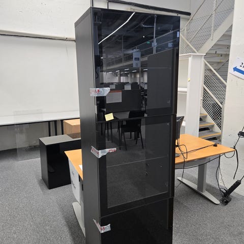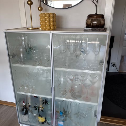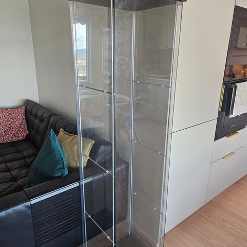 Vitrineskap i glass m 3 glasshyller, sort bunn- og topplate. Integrert lys i topplaten.
