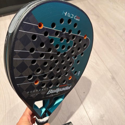 Bullpadel Hack 04 Hybrid selges da den ikke passet helt for meg! Skalet av 4 steder veldig smått, men har ingenting å si! Slagflatene er 100% hele og kun brukt 6-7 ganger!