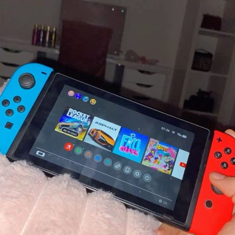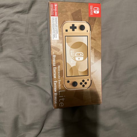 Nintendo Switch spillkonsoll med to Joy-Con-kontrollere i blå og rød farge, inkludert to ekstra kontrollere, lader, dokkingstasjon og bæreveske med motiv fra The Legend of Zelda. Konsollen er egnet for bærbar og stasjonær spilling.