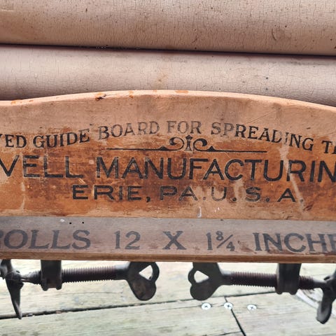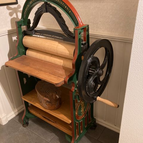 Manuell modell med håndtak og ruller for klesvask. Tradisjonelt design som brukes til håndvask av klær.