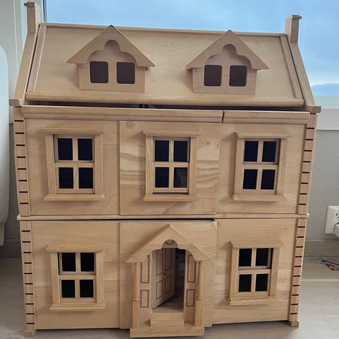 Nydelig dukkehus i tre. Solid og bestandig. Følger med 5 dukker og diverse møbler til kjøkken, spisestue, stue soverom og bad. Her kan det suppleres med egne møbler etter ønske.