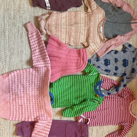 Lillelam barneklær i merinoull, størrelse 104, farge grå. Passer for både gutter og jenter. Settet består av en genser og bukse med detaljer i hvitt. Materialet gir varme og komfort, egnet for barn i denne størrelsen.