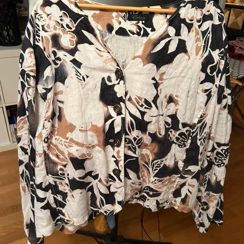 Kort jakke i 100% lin. Fine detaljer. Størrelse XL/XXL. Noen ørsmå prikker bak på ene ermet gikk ikke av i vask.